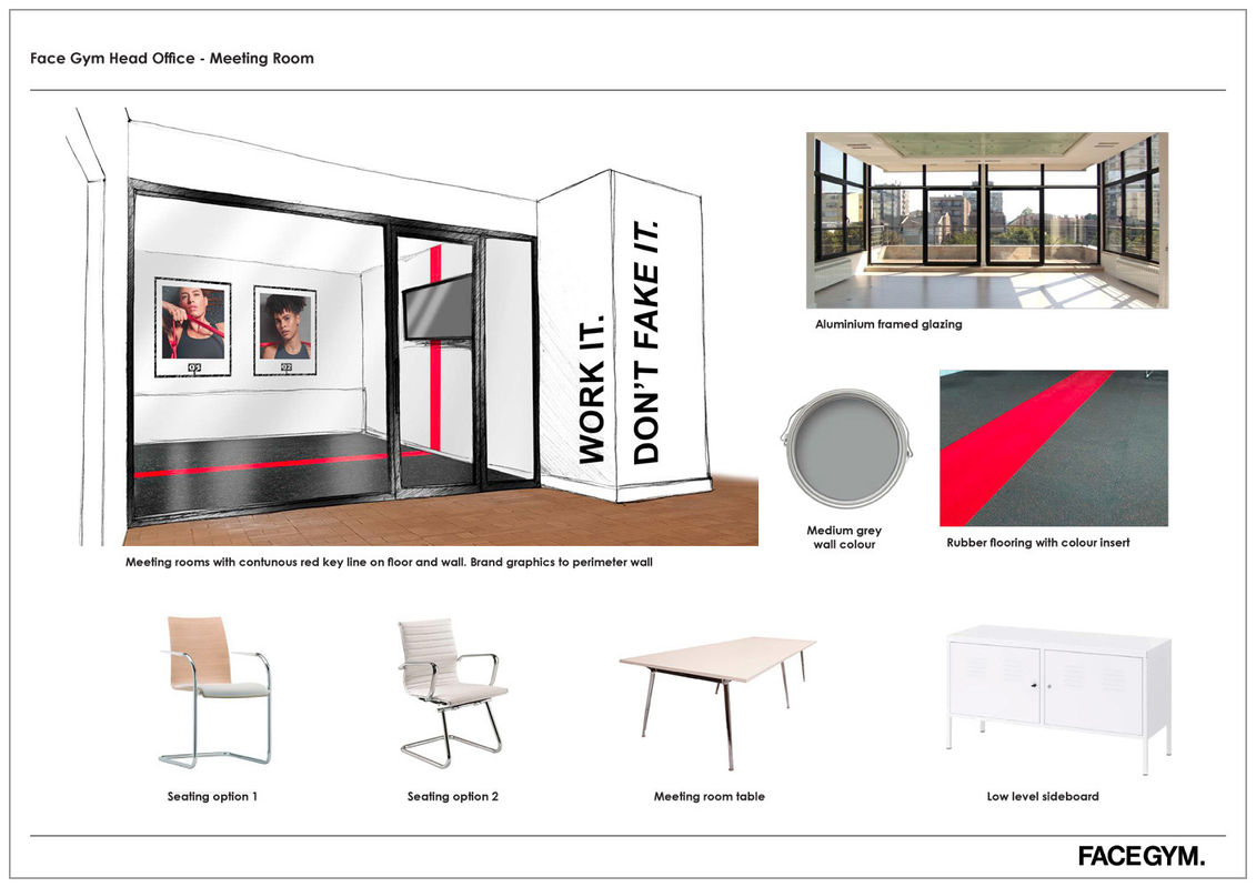 Full-height glass partitions divide meeting rooms to reflect FaceGym's clear and transparent ethos.